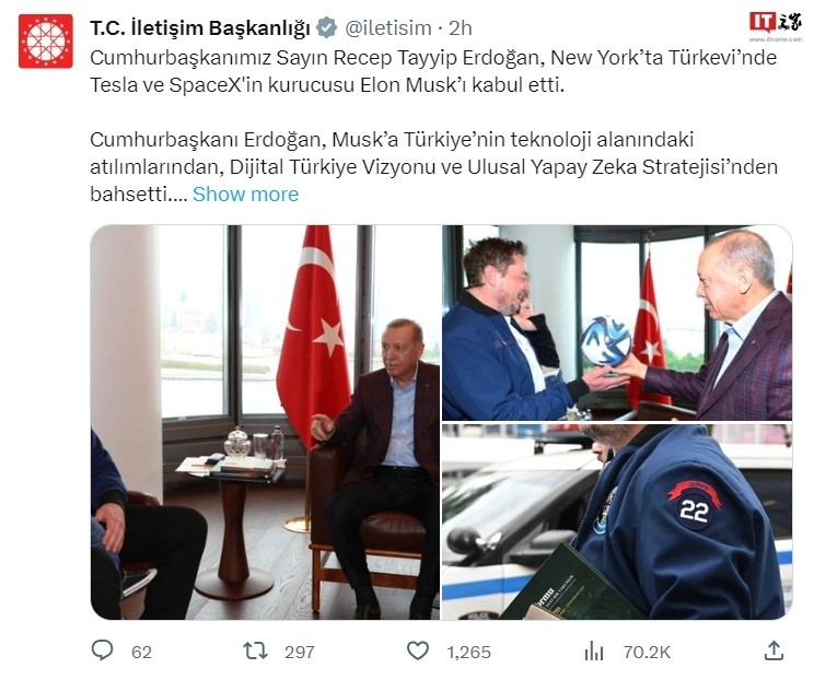 土耳其總統(tǒng)府通訊局在 X(推特)上發(fā)文表示,土耳其總統(tǒng)雷杰普?塔伊普?埃爾多安在紐約圖爾克維酒店接見了埃隆?馬斯克,他向馬斯克介紹了土耳其在技術方面的突破、數(shù)字土耳其愿景和國家人工智能戰(zhàn)略。