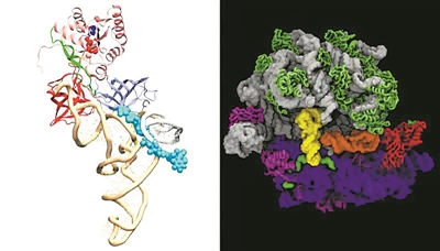 在左圖中,超級(jí)計(jì)算機(jī)模擬揭示了抗生素依維寧(淺藍(lán)色)如何與細(xì)菌核糖體中的 tRNA 分子(金色)相互作用。右圖顯示,在沒(méi)有抗生素的情況下,不正確的 tRNA(橙色)如何進(jìn)入核糖體。