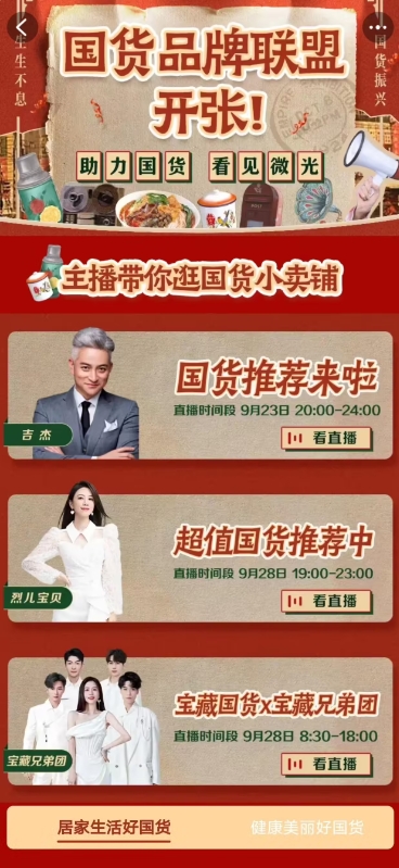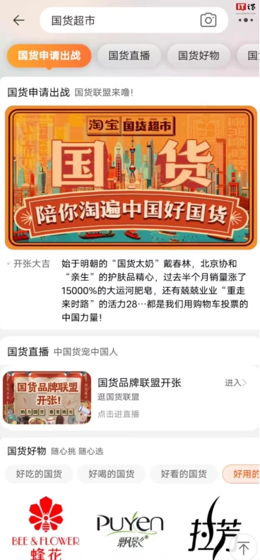 淘寶上線“國貨超市”,包含華為、小米、海爾、vivo、TCL 等品牌,商品涵蓋手機(jī)、家電、日用品、食品、美妝等。