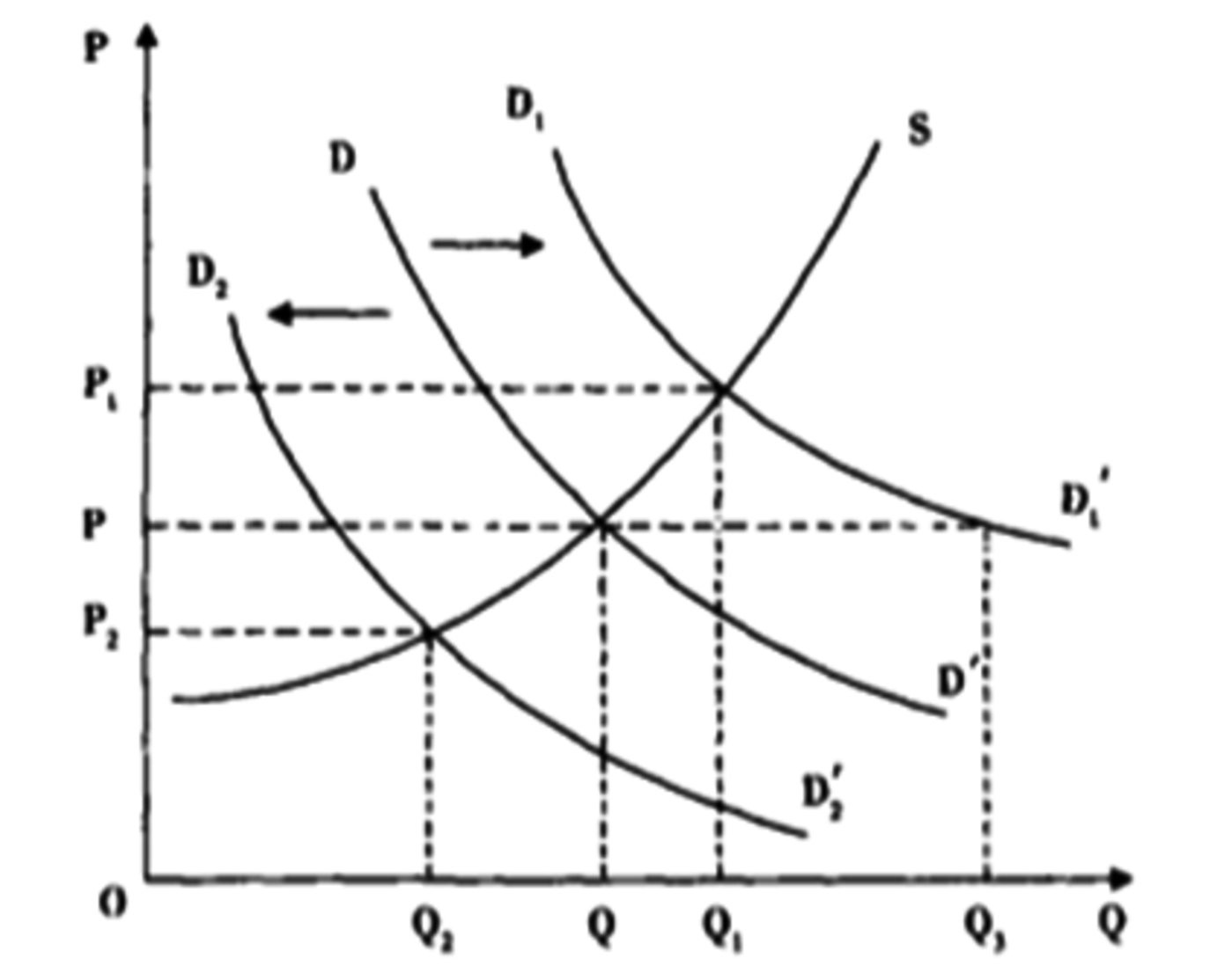 而當(dāng)經(jīng)濟(jì)周期處于滯脹期時(shí),消費(fèi)者降低消費(fèi)預(yù)算,尤其是降低對(duì)可消費(fèi)品的預(yù)算,這時(shí)候 DD'曲線左移為D?D?’,新的需求曲線與供給曲線曲線S,給出新的供需平衡點(diǎn)——更低的價(jià)格P?,更少的數(shù)量Q?。