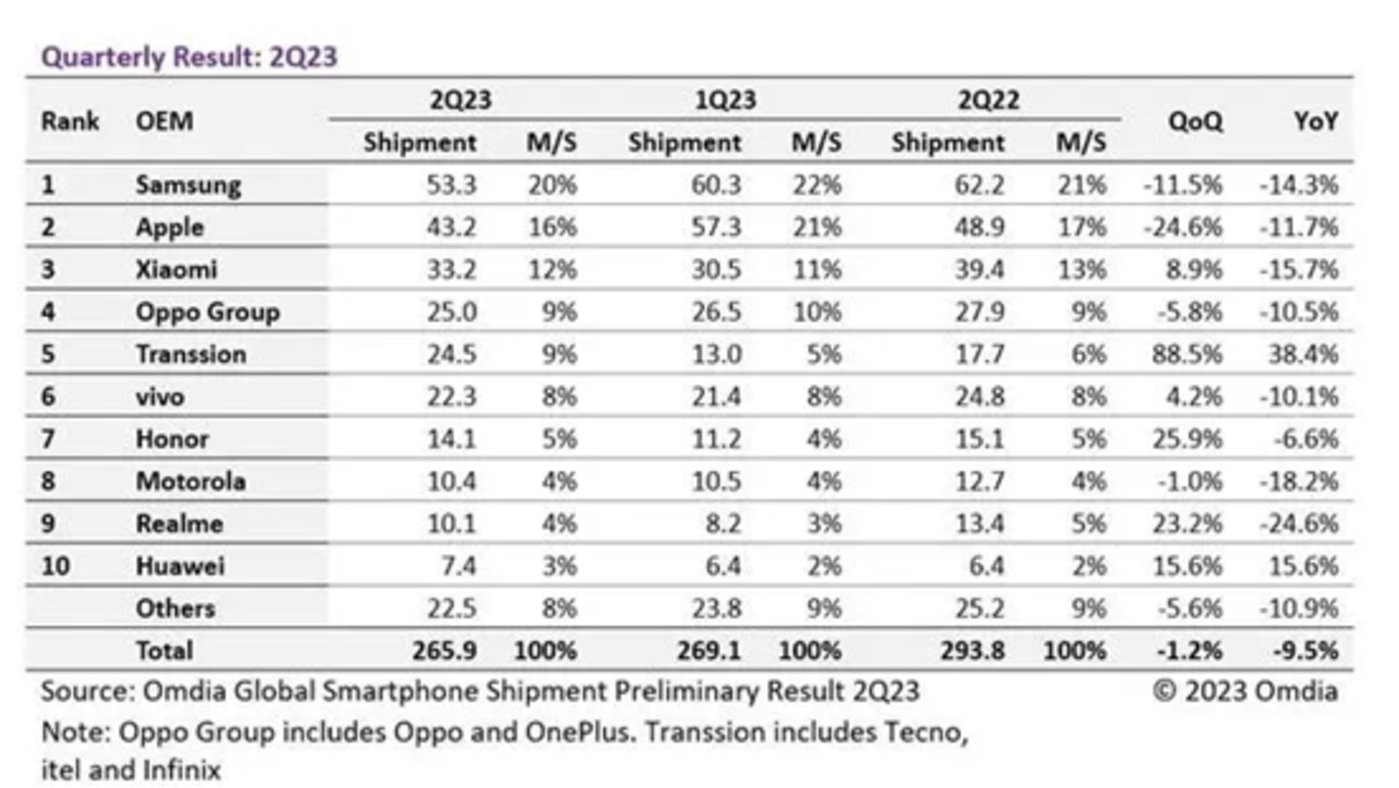 圖:2023Q2 全球智能手機(jī)市場(chǎng)出貨量