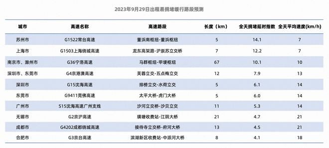 與此同時(shí),高德地圖發(fā)布了《2023 中秋·國慶假期出行預(yù)測報(bào)告》報(bào)告,預(yù)測了即將到來的黃金周交通出行狀況。該報(bào)告數(shù)據(jù)顯示,預(yù)計(jì) 9 月 29 日全國高速出程易擁堵緩行路段有 G1522 常臺(tái)高速蘇州段(董浜南樞紐-董浜樞紐),平均車速約 7km/h;其他還有 G1503 上海繞城高速(龍東高架路-滬崇蘇立交橋),以及 G36 寧洛高速南京、滁州段(馬群樞紐-甲埂樞紐)等。