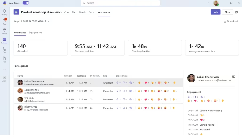 新功能的檢查非常簡(jiǎn)單。組織過過去會(huì)議的用戶可以轉(zhuǎn)到該會(huì)議,然后單擊“聊天”窗格。然后,他們可以單擊“出席”選項(xiàng)卡來獲取統(tǒng)計(jì)信息,例如會(huì)議的開始和結(jié)束時(shí)間以及平均出席時(shí)間等等。