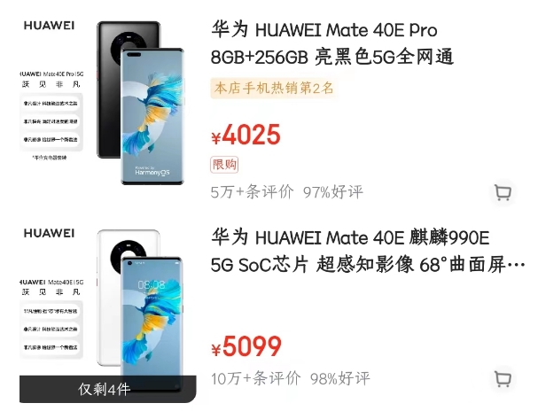 在京東自營(yíng)平臺(tái)上,華為不少老款機(jī)型都開(kāi)始促銷。例如,華為Mate 40E Pro 8GB+256GB版本當(dāng)前售價(jià)僅為4000元出頭。