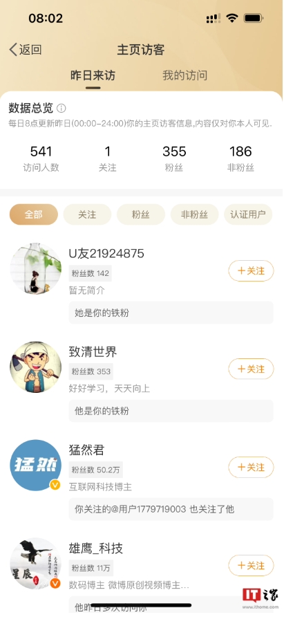頁面顯示,微博會每日 8 點更新昨日主頁訪客信息,內(nèi)容僅對本人可見。不論訪客是否關(guān)注博主,博主都能看到這些訪客,而且還能按照全部、關(guān)注、粉絲、非粉絲和認(rèn)證用戶分類查看。