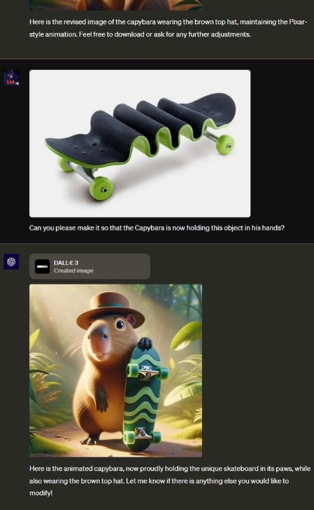 ChatGPT 新功能不僅限于處理文本文件。在 Threads 上,有用戶發(fā)布了一段對話的截圖,他們上傳了一張水豚的圖片,ChatGPT 可以通過 DALL-E 3 根據(jù)它創(chuàng)建一個皮克斯風格的圖片。然后他們又上傳了另一張圖片,這次是一塊扭曲的滑板,并要求 ChatGPT 將它插入上述圖片,ChatGPT 也成功做到了,不知道為什么還給水豚戴上了帽子。