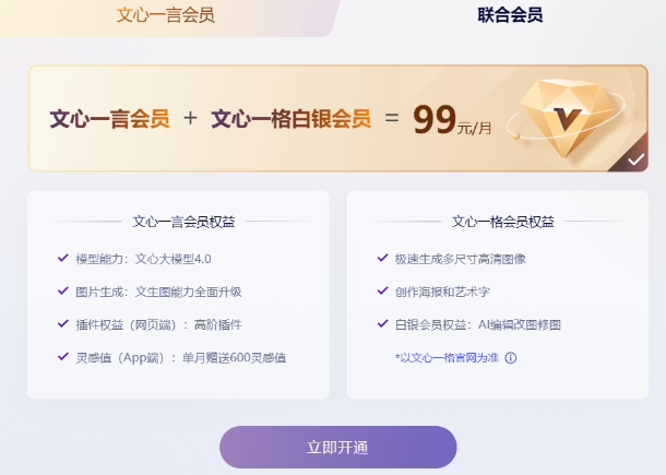 據(jù)介紹,文心一言會員單月購買價格為 59.9 元,連續(xù)包月價格為 49.9 元(次月以 49.9 元 / 月自動續(xù)費(fèi),可隨時取消)。此外,百度還推出了文心一言 + 文心一格(白銀)的聯(lián)合會員,價格為 99 元 / 月。
