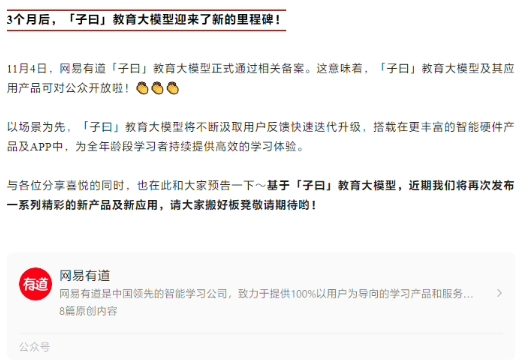 據(jù)網(wǎng)易有道官方公眾號,網(wǎng)易有道“子曰”教育大模型今日通過相關(guān)備案,該大模型及其應(yīng)用產(chǎn)品將對公眾開放。