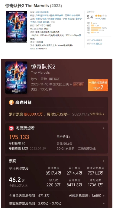 值得一提的是,近期上映的漫威新片《驚奇隊(duì)長 2》票房突破 8000 萬,首日票房 2714.4 萬。截至發(fā)稿,該片豆瓣評分 5.4 分,3 星評價占 42.8%。