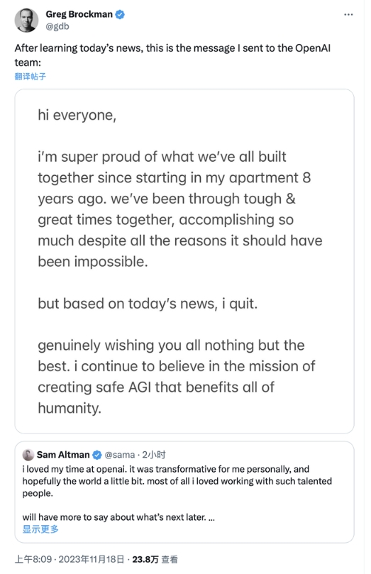 在奧特曼該推文后沒(méi)多久,布羅克曼轉(zhuǎn)發(fā)也宣布將離開(kāi)公司。