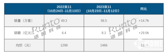 根據洛圖科技(RUNTO)最新的雙十一大促期中國智能門鎖市場總結來看,2023年雙十一大促期間,中國智能門鎖線上市場銷量為56.5萬套,同比增長14.7%;銷額為8.3億元,同比增長29.5%;均價為1466元,比去年同期增長168元。