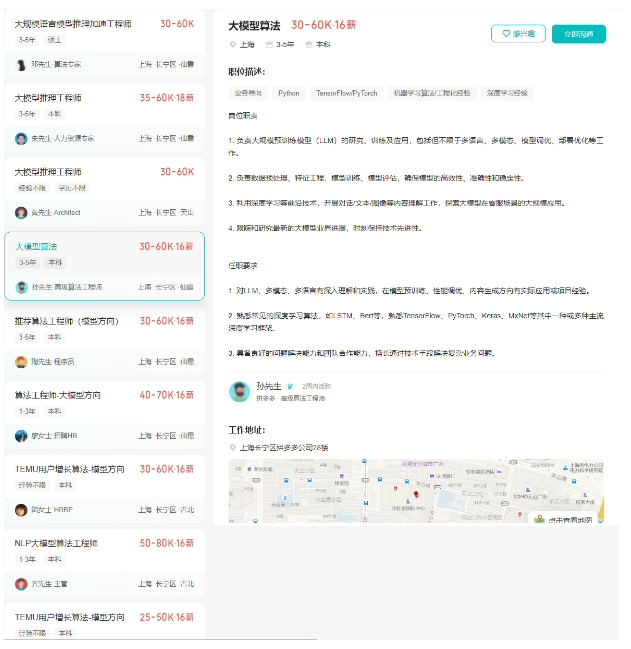 拼多多官方的招聘職位目錄中已經(jīng)出現(xiàn)了大模型(LLM)和 NLP 算法等領(lǐng)域的職位,大部分位于上海長(zhǎng)寧區(qū),薪資大多在 30-60K 之間,其中不乏 50-80K 且 16 薪的存在。