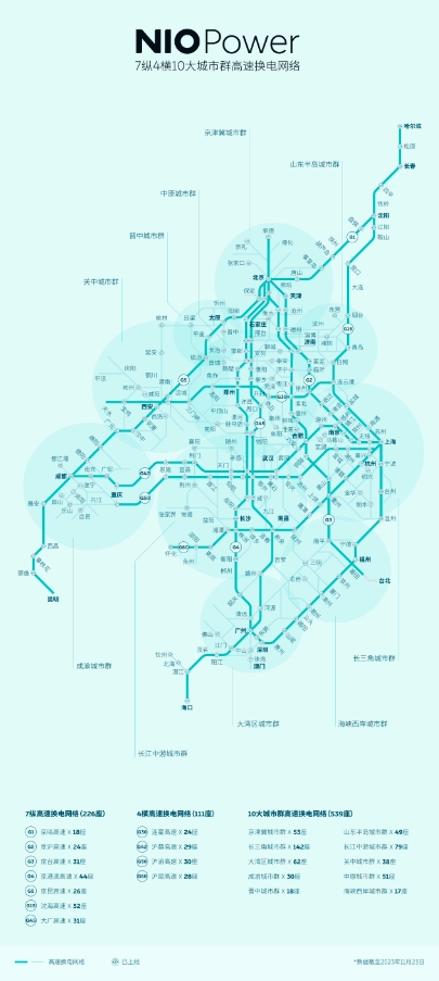 截至 11 月 23 日,蔚來(lái)已在全國(guó)累計(jì)建成 2127 座換電站,其中 660 座高速換電站,完成 7 縱 4 橫 10 大城市群高速換電網(wǎng)絡(luò)布局:G1 京哈、G2 京滬、G3 京臺(tái)、G4 京港澳、G5 京昆、G15 沈海、G30 連霍蘇陜段、G42 滬蓉、G45 大廣京廣段、G50 滬渝、G60 滬昆滬湘段和京津冀、長(zhǎng)三角大灣區(qū)、成渝、長(zhǎng)江中游、山東半島、關(guān)中、中原、晉中、海峽西岸。