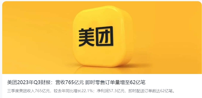 美團(tuán)昨日發(fā)布了 2023 年第三季度財(cái)報(bào),該季度營收 764.7 億元,上年同期營收 626.2 億元,同比增長 22.1%,市場預(yù)期 760.09 億元。