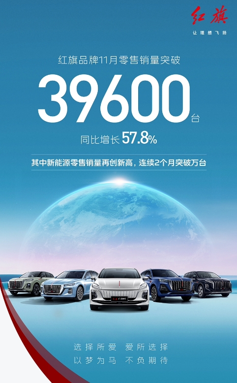 一汽紅旗今晚公布了月度銷量數(shù)據(jù),紅旗品牌 11 月零售銷量突破 39600 臺,同比增長 57.8%,其中新能源汽車零售銷量再創(chuàng)新高,實現(xiàn)連續(xù) 2 個月突破萬臺。