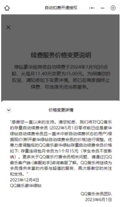 有網(wǎng)友反饋,QQ 音樂日前向微信用戶發(fā)送“續(xù)費(fèi)服務(wù)價(jià)格變更提醒”:2024 年 1 月 9 日 0 點(diǎn)起,綠鉆豪華版微信自動(dòng)續(xù)費(fèi)的費(fèi)用將從 11.4 元 / 月變更至 15 元 / 月。