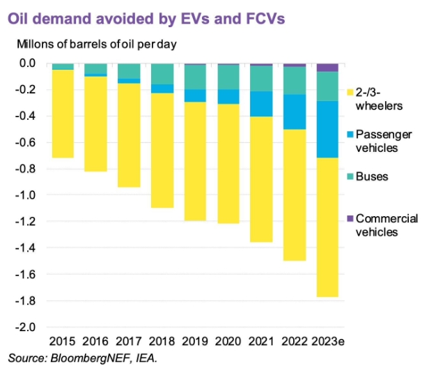 從 2015 年到 2023 年,減少的石油消耗量幾乎增加了兩倍半,從 2015 年每天約 72 萬(wàn)桶增加到 2023 年的近 180 萬(wàn)桶,預(yù)計(jì)這一趨勢(shì)將進(jìn)一步加速。
