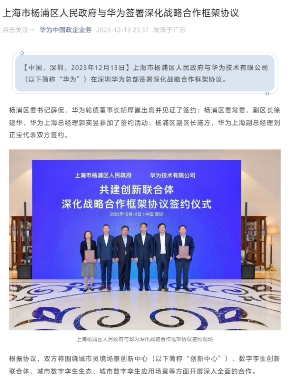 據(jù)“華為中國(guó)政企業(yè)務(wù)”官方公眾號(hào),上海市楊浦區(qū)人民政府與華為技術(shù)有限公司 13 日在深圳華為總部簽署深化戰(zhàn)略合作框架協(xié)議。