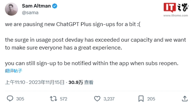OpenAI 首席執(zhí)行官 Sam Altman 在 X 平臺發(fā)文稱,將暫停 ChatGPT Plus 新用戶注冊。“開發(fā)日后使用量的激增超出了我們的承受能力,我們希望確保每個人都有良好的體驗。”