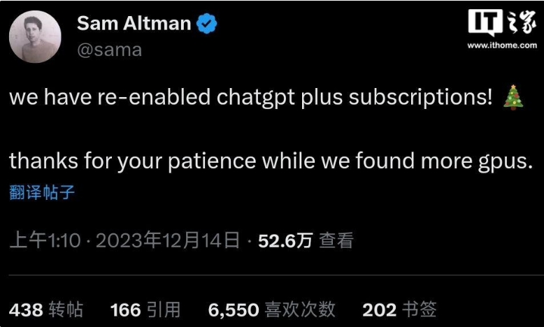 時隔近一個月,Sam Altman 今日宣布,已重新開放 ChatGPT Plus 訂閱。“感謝您的耐心等待,我們找到了更多 GPU。”