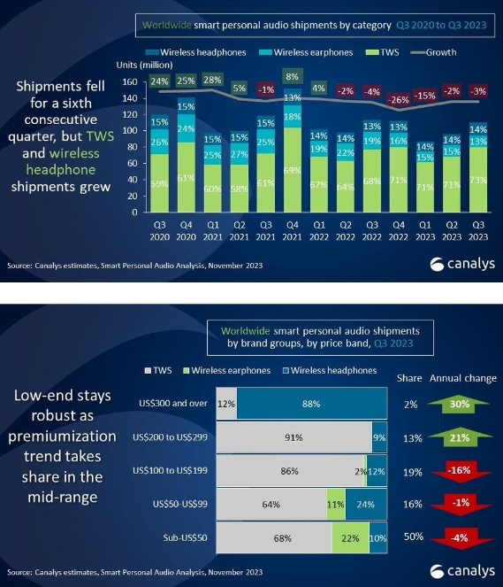 根據(jù)市場(chǎng)調(diào)查機(jī)構(gòu) Canalys 公布的最新研報(bào),2023 年第 3 季度全球智能個(gè)人音頻市場(chǎng)出貨量 1.1 億臺(tái),同比下降 3%。