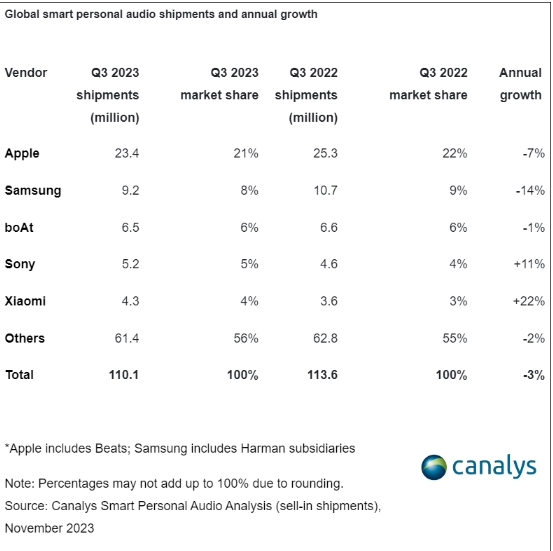 2023Q3 全球個(gè)人音頻市場(chǎng)報(bào)告:總出貨量 1.1 億臺(tái),蘋(píng)果 / 三星 / boAt / 索尼 / 小米前五 10:43:10