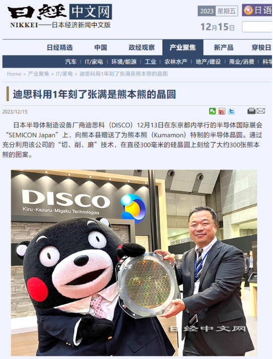 據(jù)日本經(jīng)濟新聞報道,日本半導(dǎo)體制造設(shè)備廠商迪思科(DISCO)日前在東京 SEMICON Japan 半導(dǎo)體國際展會期間,向熊本縣贈送了一塊特制的半導(dǎo)體晶圓。