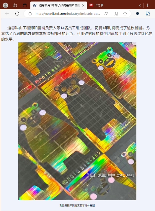該公司組建了一個由 14 名員工組成的團隊,花費了 1 年時間來完成這枚晶圓。其稱,團隊尤其在熊本熊臉頰部分的“紅暈”花了心思,它利用硅材質(zhì)的特性,成功使其具備僅透過紅色光的功能。