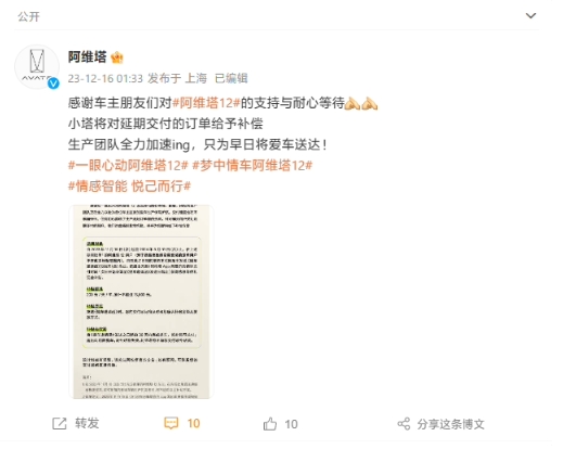 阿維塔推出“感恩等待計(jì)劃”:補(bǔ)償延期交付訂單,阿維塔 12 每車每天 200 元 09:32:49