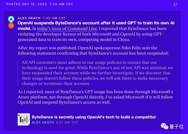 而在此消息被披露不久,The Verge 進(jìn)一步稱 OpenAI 已經(jīng)暫停了字節(jié)跳動(dòng)的賬戶。