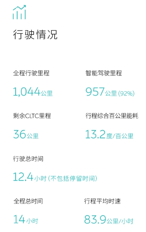 蔚來官方微博放出的數(shù)據(jù)來看,經(jīng)過超14小時行駛后,此次全程行駛里程1044公里,平均時速83.9公里/小時,平均百公里能耗13.2kWh。