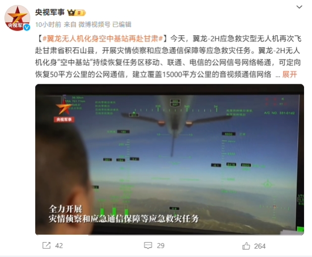 翼龍-2H 無人機(jī)再赴甘肅地震災(zāi)區(qū)執(zhí)行任務(wù):可定向恢復(fù) 50 平方公里公網(wǎng)通信 09:32:29