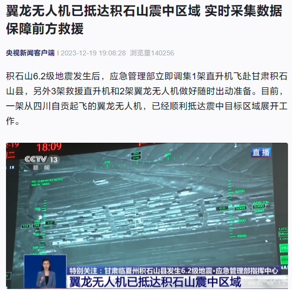 此次為“翼龍”無人機(jī)第二次飛赴甘肅地震災(zāi)區(qū)執(zhí)行任務(wù)。據(jù)央視新聞 19 日?qǐng)?bào)道,一架同樣從四川自貢起飛的翼龍無人機(jī)已順利抵達(dá)震中目標(biāo)區(qū)域展開工作,其利用遠(yuǎn)紅外線科技裝置,實(shí)時(shí)采集災(zāi)區(qū)上空實(shí)時(shí)的畫面以及相關(guān)數(shù)據(jù),為前方指揮部提供決策依據(jù)。