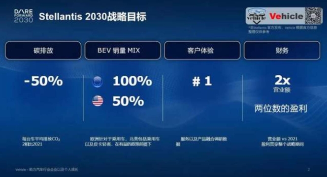 Stellantis 在這一戰(zhàn)略中提到,預(yù)期在 2030 年,集團(tuán)將擁有 75 款純電動(dòng)汽車并銷售 500 萬(wàn)輛純電動(dòng)汽車,旗下每臺(tái)車平均排放二氧化碳較 2021 年減少 50%。