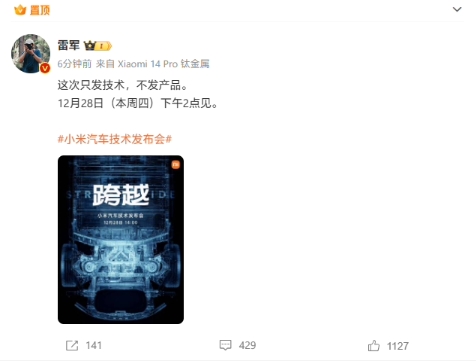 昨天晚上,小米創(chuàng)始人雷軍也“親自召喚”小米汽車官方微博,暗示新車的預熱工作即將展開。隨后時間來到今天上午,雷軍又發(fā)文解釋稱“這次只發(fā)技術,不發(fā)產品。”