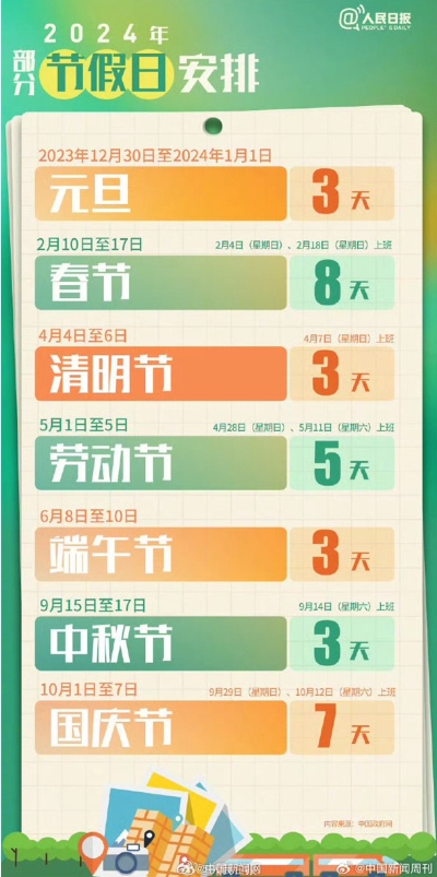 2024年的部分節(jié)假日安排也大體出爐,2月10-17日是春節(jié)假期,但需要調(diào)休,2月4日、18日周日上班。