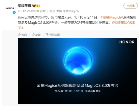榮耀今日宣布,榮耀 Magic6 系列旗艦新品及 MagicOS 8.0 發(fā)布會定檔 1 月 10 日至 11 日。