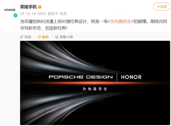 榮耀手機此前已經(jīng)宣布聯(lián)動保時捷設計,slogan 為“為先鋒而生”。