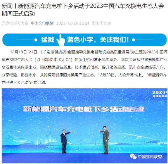 在近日舉辦的 2023 中國(guó)汽車充換電生態(tài)大會(huì)上,“新能源汽車充電樁下鄉(xiāng)活動(dòng)”正式啟動(dòng)。