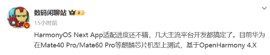 據(jù)博主 @數(shù)碼閑聊站 今日爆料,華為 HarmonyOS Next App 適配進度良好,幾大主流平臺開發(fā)都搞定了。目前華為在 Mate40 Pro / Mate60 Pro 等麒麟芯片機型上測試,基于 OpenHarmony 4.X 打造。