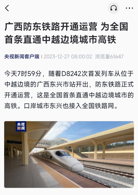 據(jù)央視新聞消息,今天 7 時(shí) 59 分,隨著 D8242 次首發(fā)列車從位于中越邊境的廣西東興市站開出,防東鐵路正式開通運(yùn)營(yíng),這是全國(guó)首條直通中越邊境城市的高鐵。口岸城市東興也接入全國(guó)鐵路網(wǎng)。