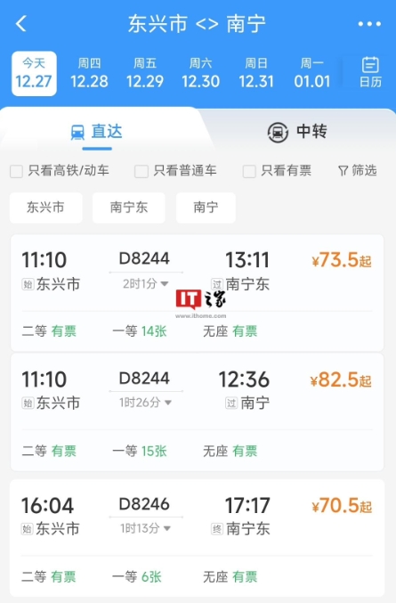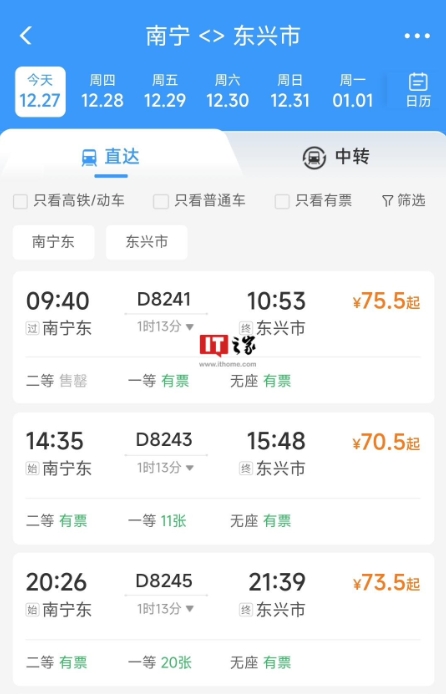 南寧到東興的票價(jià)為 70.5 元起,分別在上午、下午、晚上各有一趟列車。
