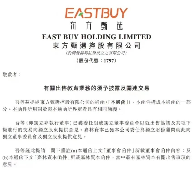 東方甄選公告稱:“出售事項乃廣義新東方集團業(yè)務(wù)重組的一部分,旨在更明確地劃分其業(yè)務(wù)線,及更好地使其業(yè)務(wù)部門與運營環(huán)境保持一致。目前,本集團及新東方集團所運營的行業(yè)相互重疊,其業(yè)務(wù)根據(jù)其產(chǎn)品 / 服務(wù)的交付媒介進行劃分。出售事項后,本集團及新東方集團所運營的行業(yè)將相互區(qū)分且各不相同,本集團不再經(jīng)營在線教育領(lǐng)域,而是成為一家專門的自營產(chǎn)品及直播業(yè)務(wù)運營商。”
