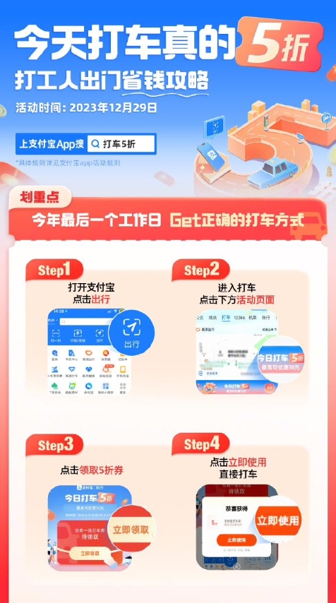 今天是 2023 年最后一個工作日,支付寶宣布推出“打車 5 折”活動,最高可立減 10 元。