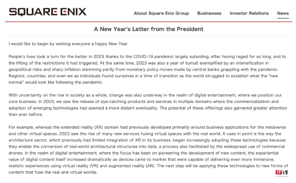 Square Enix 新任社長(zhǎng)桐生隆司日前發(fā)布了 2024 年總裁新年信,概述了公司今年的主要戰(zhàn)略方向,其中主要提到“三大重點(diǎn)”,即“改善游戲質(zhì)量”、“強(qiáng)化發(fā)行能力”、“引入 AI 等新技術(shù)”。