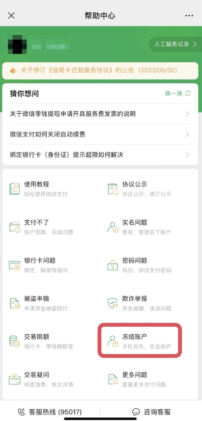 打客服電話95017轉(zhuǎn)9鍵,按提示操作就可以自助快速凍結(jié)微信支付賬戶。
