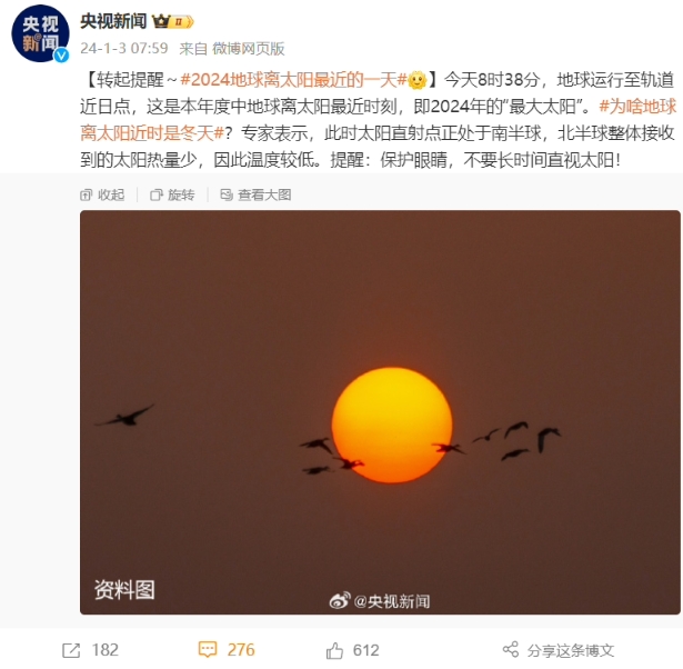 地球?qū)⒂诮裉?8 時(shí) 38 分運(yùn)行至軌道近日點(diǎn),這是本年度中地球離太陽最近時(shí)刻,即 2024 年的“最大太陽”!