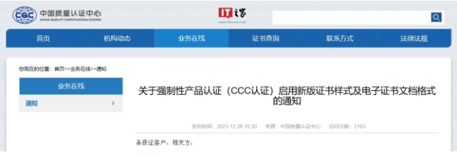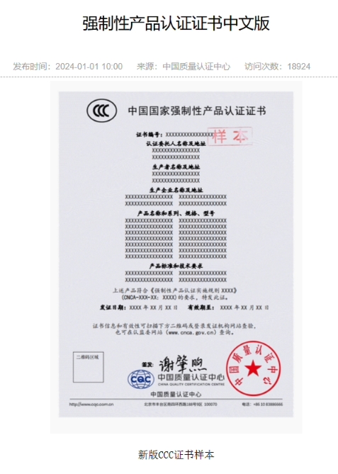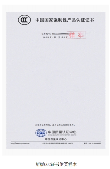 根據(jù)《國家認監(jiān)委關(guān)于完善強制性產(chǎn)品認證證書和標志管理的公告》(2023 年第 12 號)要求,自 2024 年 1 月 1 日起,中國質(zhì)量認證中心強制性產(chǎn)品認證(CCC 認證)啟用新版證書樣式及電子證書文檔格式。