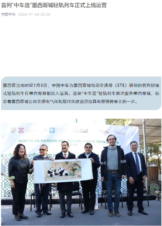 中國(guó)中車為墨西哥城電動(dòng)交通局(STE)研制的首列鉸接式輕軌列車在墨西哥首都投入運(yùn)營(yíng),這是中國(guó)制造的輕軌列車首次服務(wù)墨西哥城公共交通系統(tǒng)。