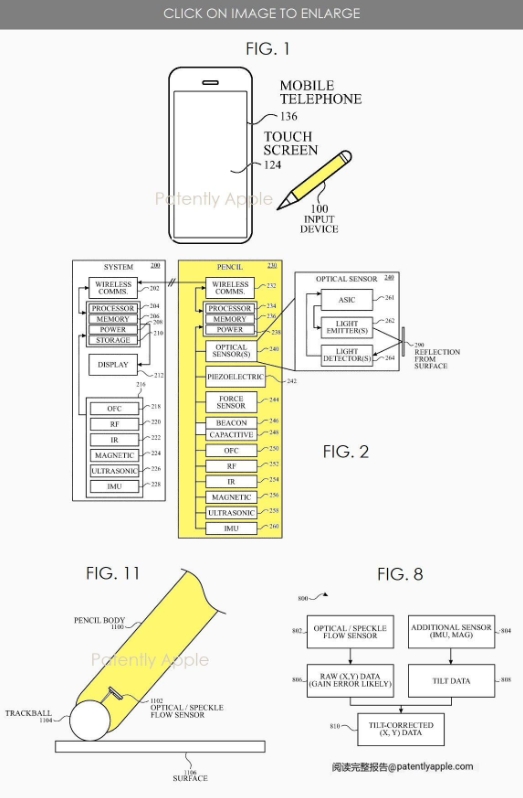 根據(jù)專利描述,新款 Apple Pencil 配有光學(xué)傳感器,可用于在不具備觸摸功能的表面上進(jìn)行交互。